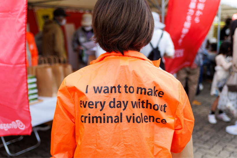 スタッフのユニフォームには、「暴力のない社会を目指そう!」というメッセージをプリント。